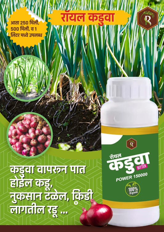 ☘️रॉयल कडुवा हे प्रॉडक्ट आपल्या नावाप्रमाणेच अतिशय कडू असून फवारणीनंतर पिकाची पाने कमीत कमी १२ ते १५ दिवस इतकी कडू असतात की कोणतीही कीड ती खाऊ शकत नाही.